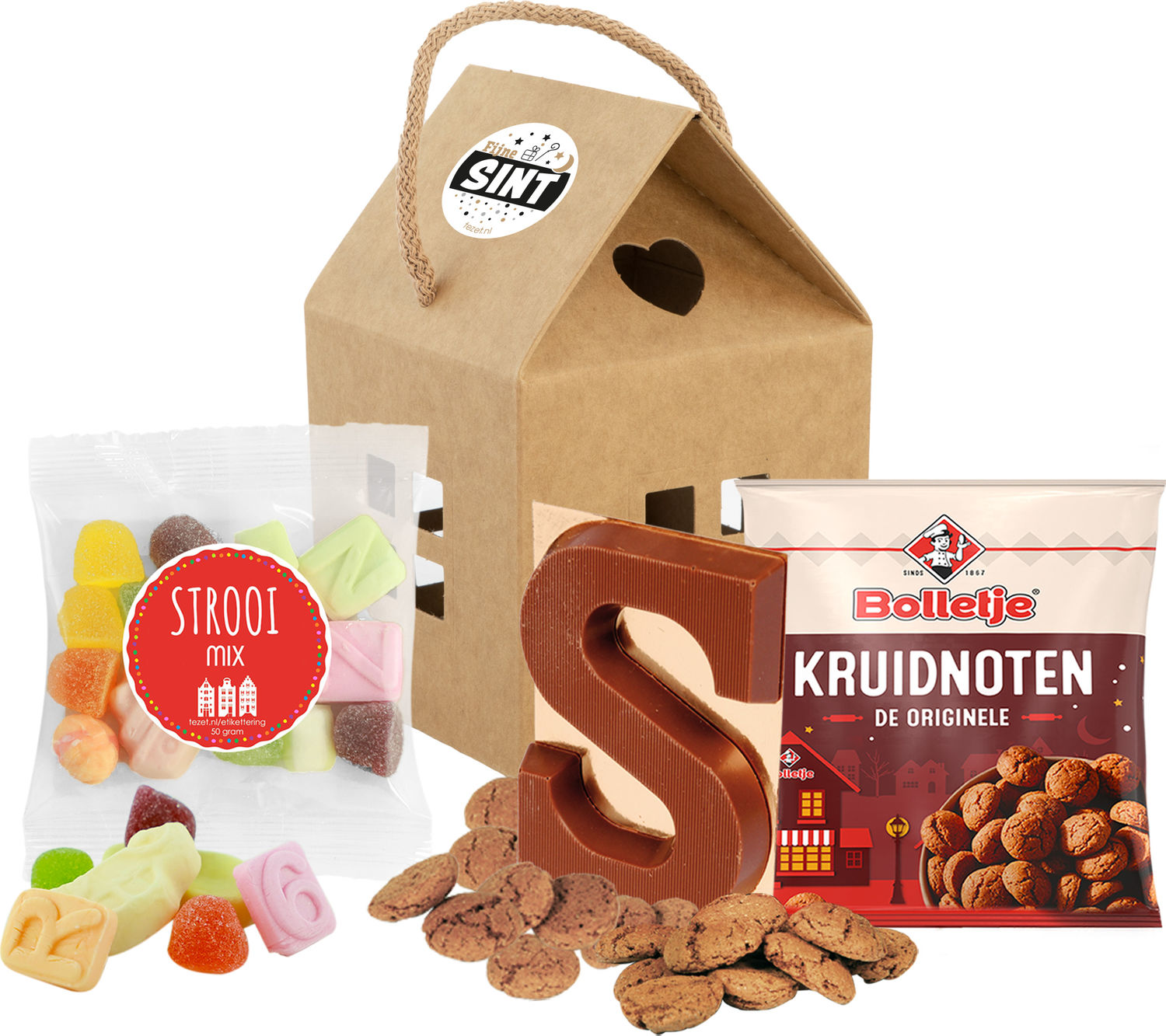 - Origineel BRUIN kartonnen geschenkhuisje (hoogte 15 cm) met inhoud en Sintetiket