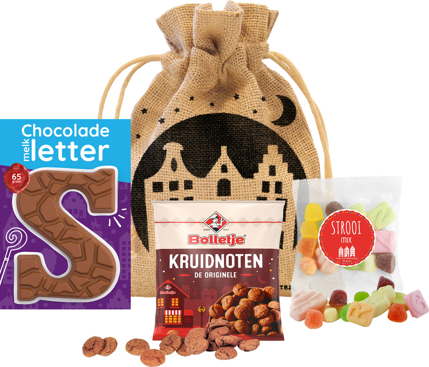 - Origineel bedrukt jute zakje (15 x 23 cm) gevuld met: