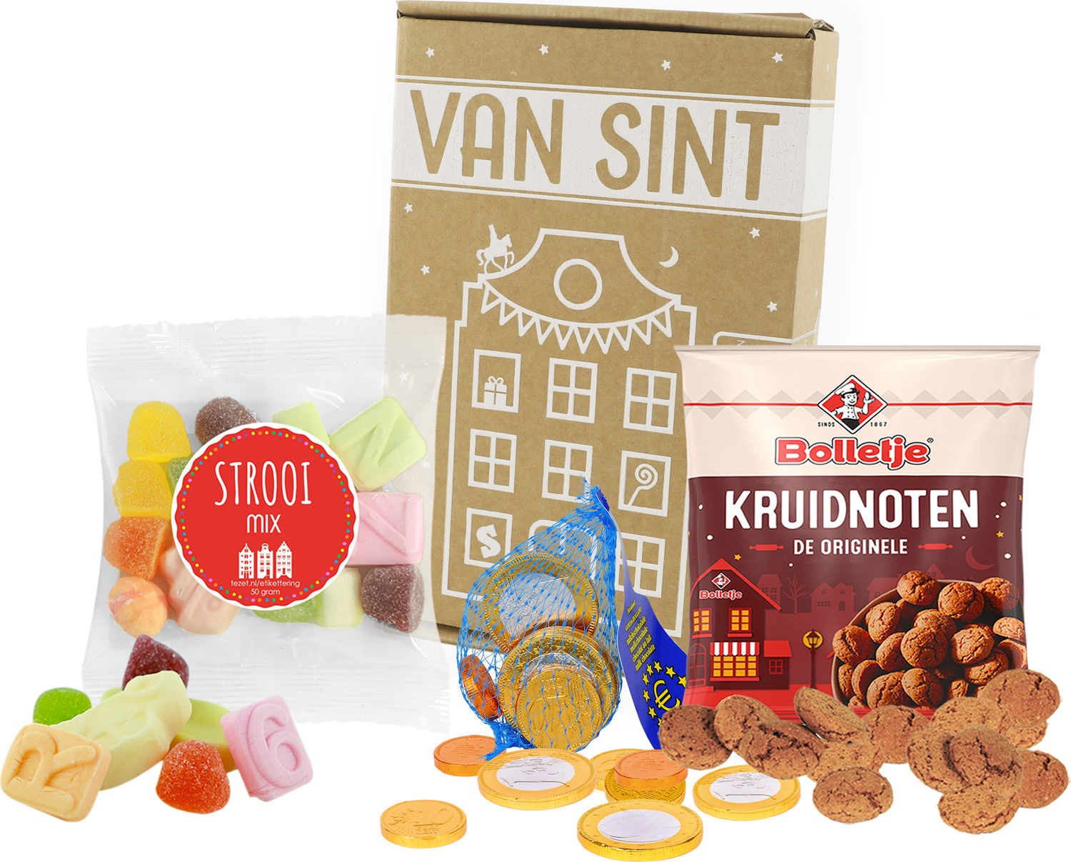 - Origineel bedrukt Sint brievenbusdoosje (19 x 12,5 x 3 cm) gevuld met: