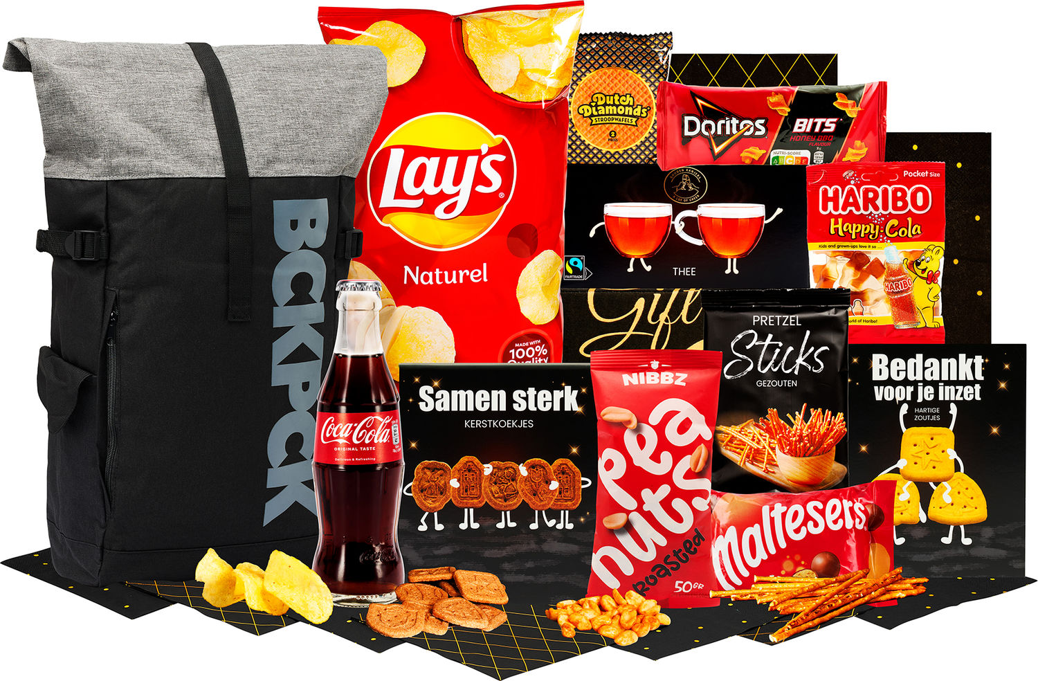 - Rugtas Norländer, 30 x 14 x 50 cm, Coca cola regular, fles, 0,2 ltr, Zwarte thee, 5 st, Hartige zoutjes peper-zeezout, 60 gr, Pretzels, 40 gr, Pinda's gezouten, 50 gr, Stroopwafel, 64 gr, 2 st, Haribo happy cola, 75 gr, Lay's chips naturel, 100 gr, Doritos bits twisties honey bbq, 30 gr, Maltesers, 37 gr, Kerstkoekjes, 80 gr, Verpakt in feestelijke kerstdoos 39 x 29 x 17,5 cm