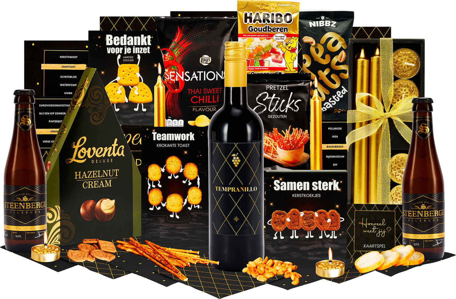 - Geschenkdoos met strik, 21 x 8,5 x 4 cm, Dinerkaarsen, 20 cm, 2 st, waxines, 4 st, Kaartspel "Weet jij het?", Servetten, 8 st, Rode wijn, Tempranillo, 0,75ltr, Bier, Steenberge, 0,25 ltr, 2 st, Hartige zoutjes peper-zeezout, 60 gr, Krokante toast, 75gr, Pretzels, 40 gr, Pinda's gezouten, 50 gr, Chocolade hazelnoot pralines, 110 gr, Haribo goudbeertjes, 75 gr, Lay's sensations thai sweet chilli, 40 gr, Kerstkoekjes, 80 gr, Verpakt in feestelijke kerstdoos 39 x 29 x 12,6 cm