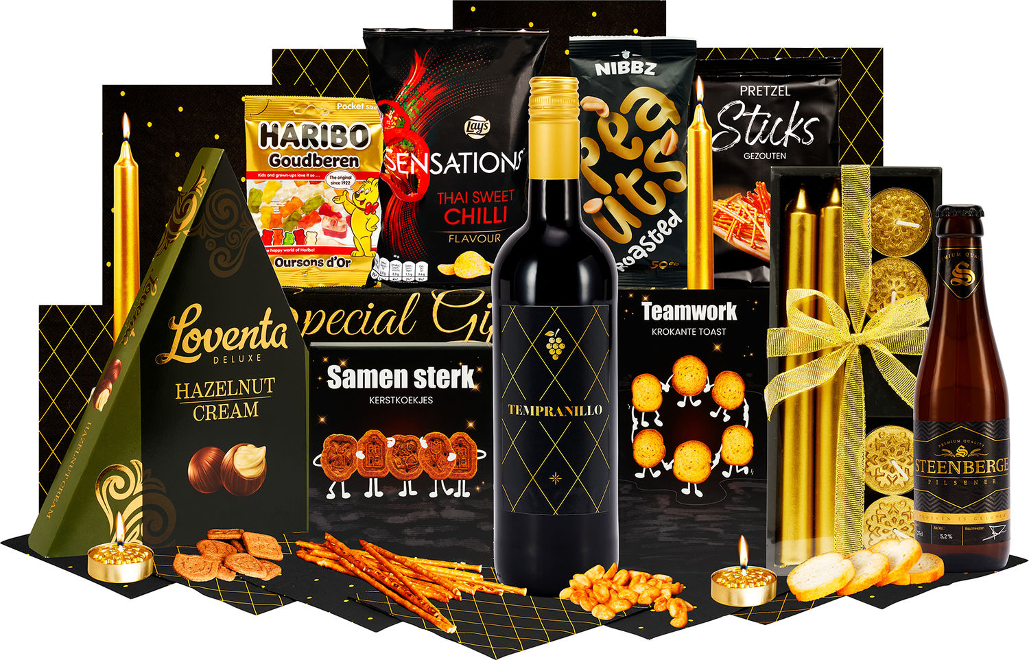 - Geschenkdoos met strik, 21 x 8,5 x 4 cm, Dinerkaarsen, 20 cm, 2 st, waxines, 4 st, Servetten, 8 st, Rode wijn, Tempranillo, 0,75ltr, Bier, Steenberge, 0,25 ltr, Krokante toast, 75 gr, Pretzels, 40 gr, Pinda's gezouten, 50 gr, Chocolade hazelnoot pralines, 110 gr, Haribo goudbeertjes, 75 gr, Lay's sensations thai sweet chilli, 40 gr, Kerstkoekjes, 80 gr, Verpakt in feestelijke kerstdoos 39 x 29 x 12,6 cm