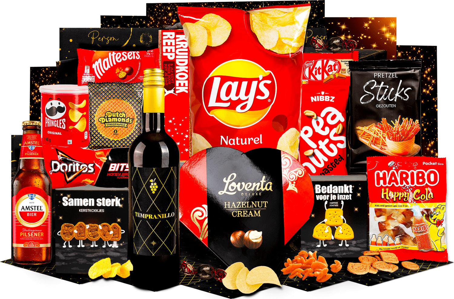 - Rode wijn, Tempranillo, 0,75ltr, Bier, Amstel, 0,33 ltr, Hartige zoutjes peper-zeezout, 60 gr, Pretzels, 40 gr, Koekreep, 110 gr, Chocolade hazelnoot pralines, 110 gr, Pinda's gezouten, 50 gr, Stroopwafel, 64 gr, 2 st, Kitkat, 41,5 gr, Haribo happy cola, 75 gr, Pringles original, 40 gr, Lay's chips naturel, 100 gr, Doritos bits twisties honey bbq, 30 gr, Maltesers, 37 gr, Kerstkoekjes, 80 gr, Verpakt in feestelijke kerstdoos 39 x 29 x 12,6 cm