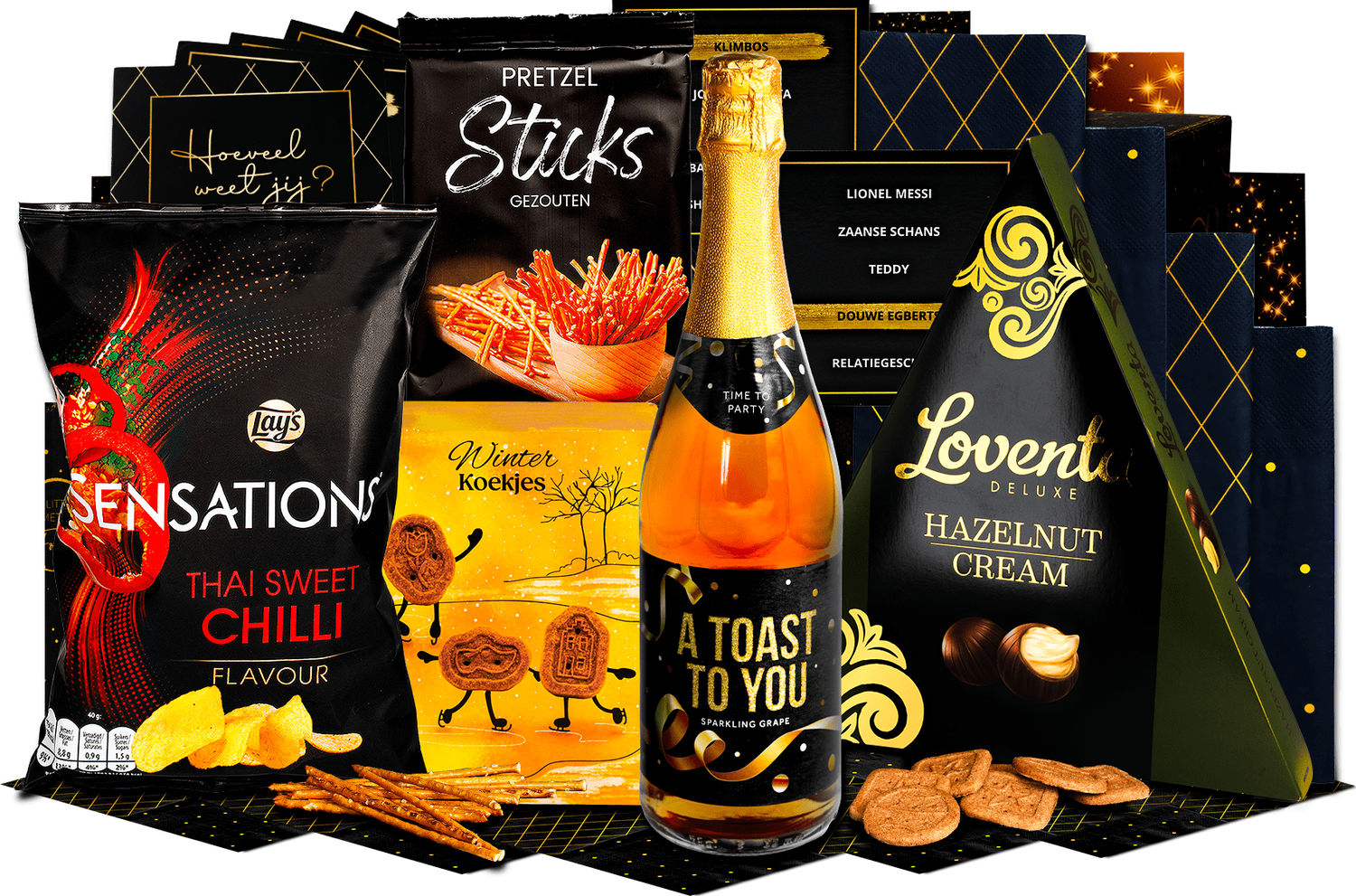 - Kaartspel "Weet jij het?", Servetten, 8 st, Sparkling grape, 750 ml, Pretzels, 40 gr, Chocolade hazelnoot pralines, 110 gr, Lay's sensations thai sweet chilli, 40 gr, Kerstkoekjes, 80 gr, Verpakt in feestelijke kerstdoos 31 x 20 x 14 cm